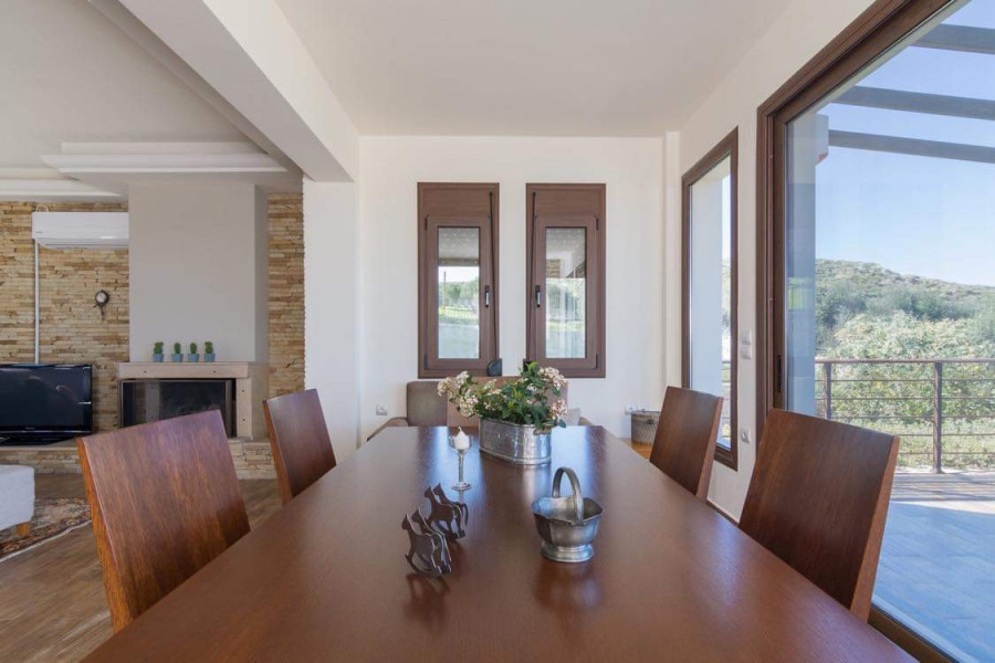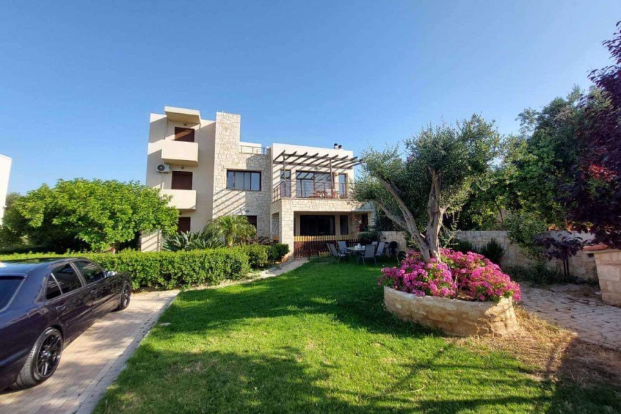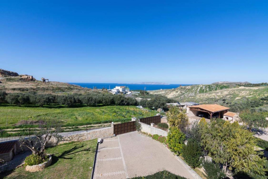 Im Großraum Karteros in Heraklion, Kreta, und nur 1400 Meter vom Sandstrand entfernt, steht ein bemerkenswertes Anwesen von etwa 365 Quadratmetern zum Verkauf, das einen atemberaubenden Meerblick bietet. Das Anwesen befindet sich auf einem eingezäunten Grundstück von 1600 Quadratmetern, umgeben von einer mit Steinen verkleideten Betonmauer und schmiedeeisernen Geländern.