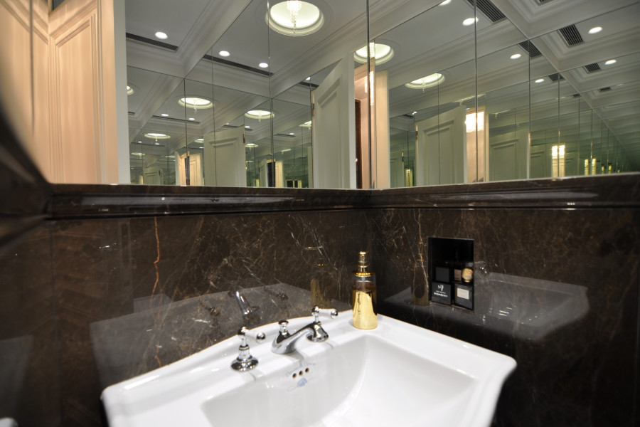 WC. Ein luxuriöses europäisches Biancissimo-WC aus Vollmarmor mit englischen Devon- und Devon-Details bietet den Gästen den perfekten Rückzugsort.