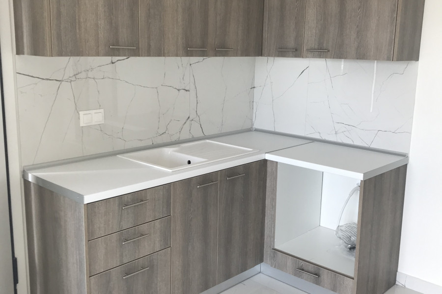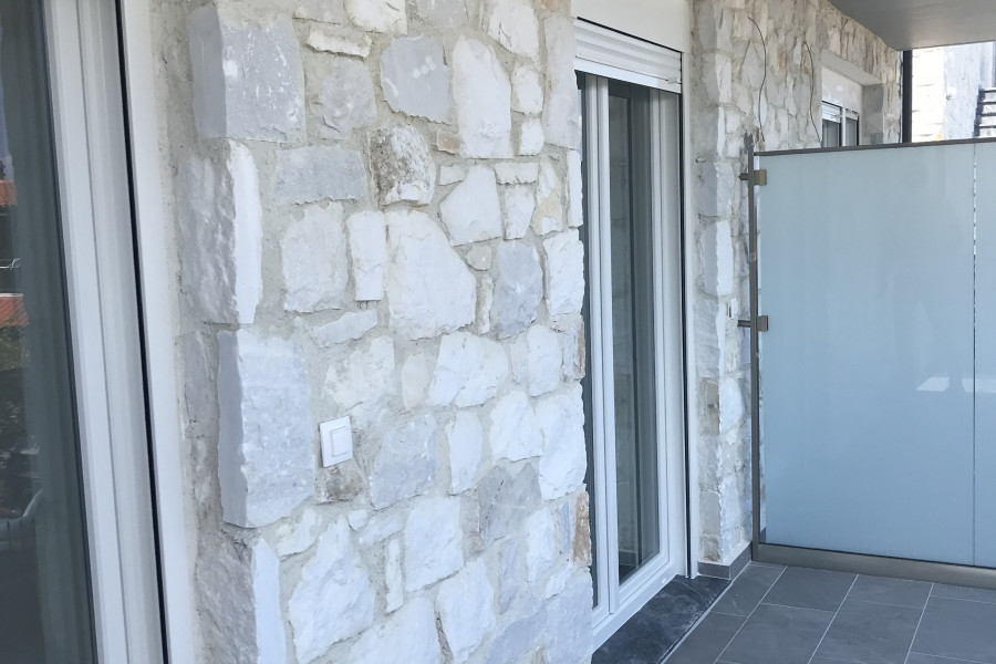 2-Zimmer-Wohnung mit Wohnzimmer und Bad nur 300 Meter vom Meer entfernt. Luxuriöse Konstruktion (Energieklasse A +) mit dicken Wänden von 70 cm mit Thermik und Schalldämmung. Innendekoration des Wohnzimmers und der Zimmer mit Stein, luxuriöse große Fliesen auf den Böden, Luxusgeländer aus Edelstahl und Glas und Parkplatz.