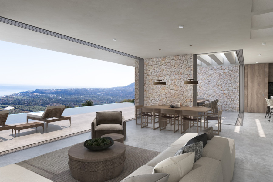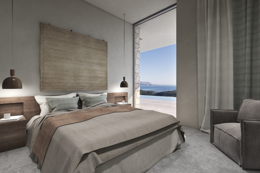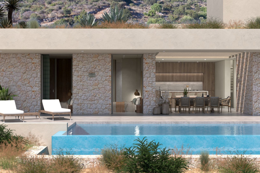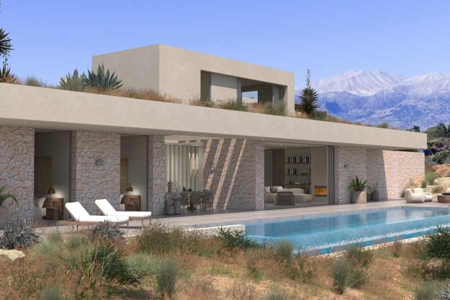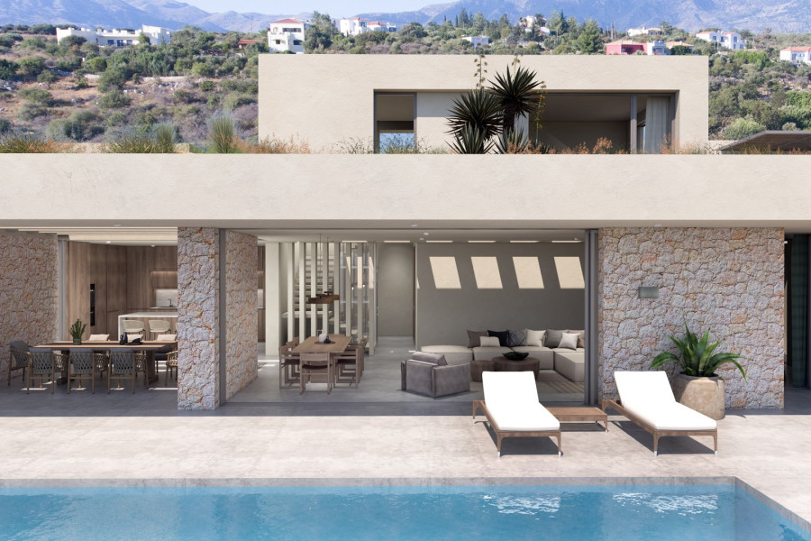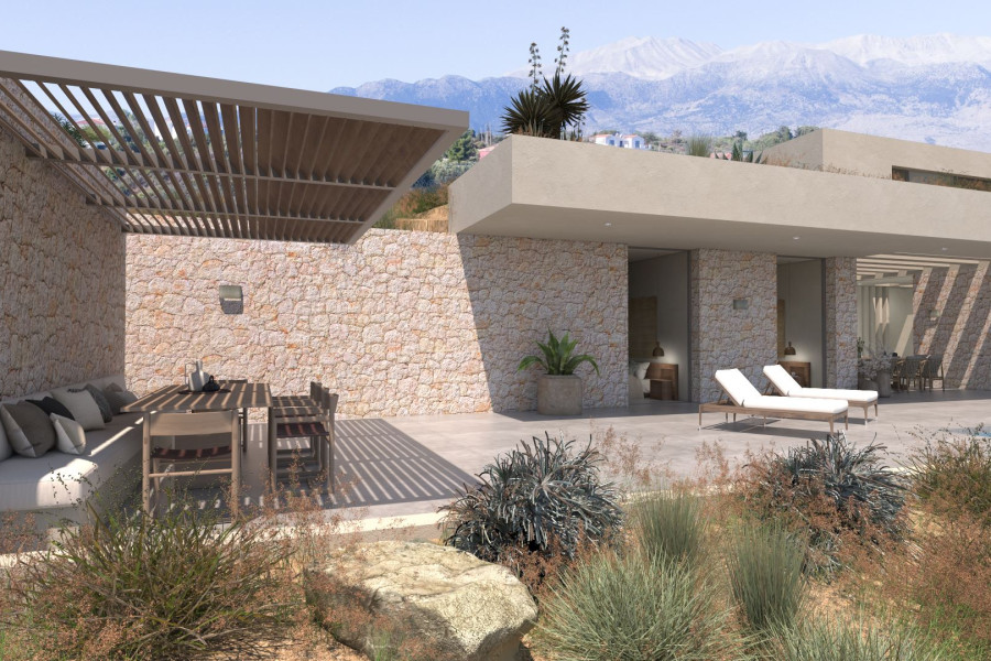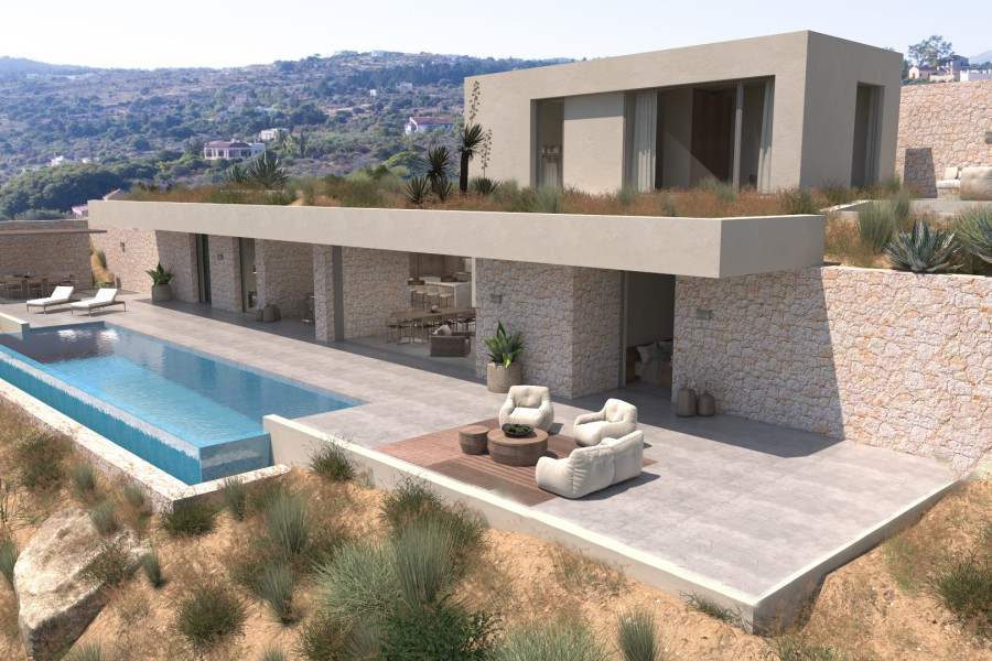 Situated in the picturesque area of Gavalochori in Apokoronas – Chania, this off-plan luxury 4Bed/5Bath (282m²) subterranean-style villa with separate studio and guest house, hammam and private pools, on a spacious plot, offers breath-taking and unobstructed sea views of Souda Bay in Chania and makes for an exquisite retreat.