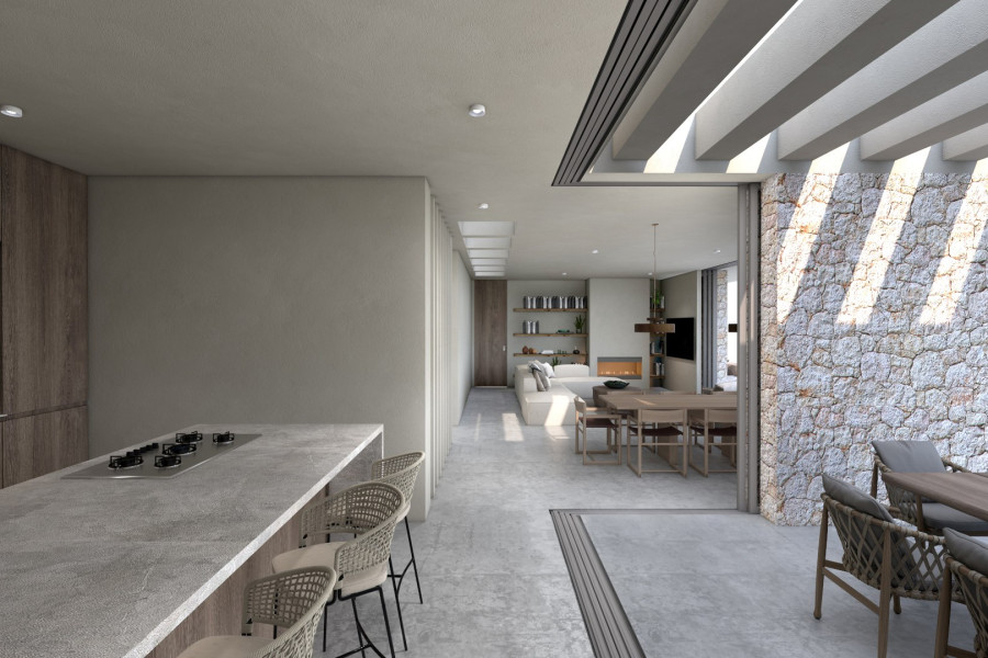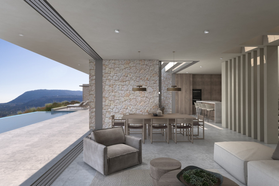 The villa is set on a generous 4, 800m² plot, providing ample space and privacy. The ground floor features three bedrooms; made up of two primary en-suite bedrooms with private patios, offering a tranquil escape, comfort and privacy. In addition, a separate studio with a bathroom provides additional accommodation options for guests or personal use. The open-plan kitchen seamlessly connects to the covered outdoor dining area, perfect for enjoying meals with a view.