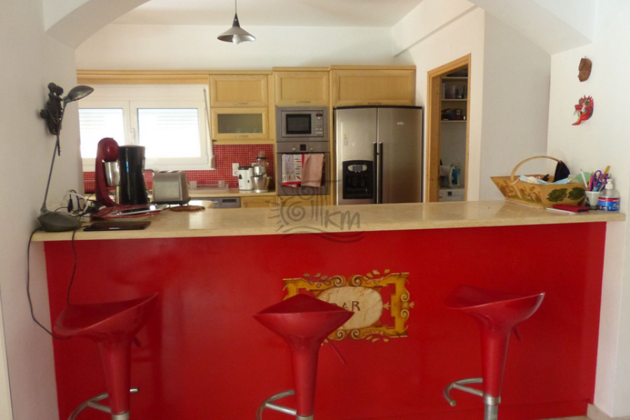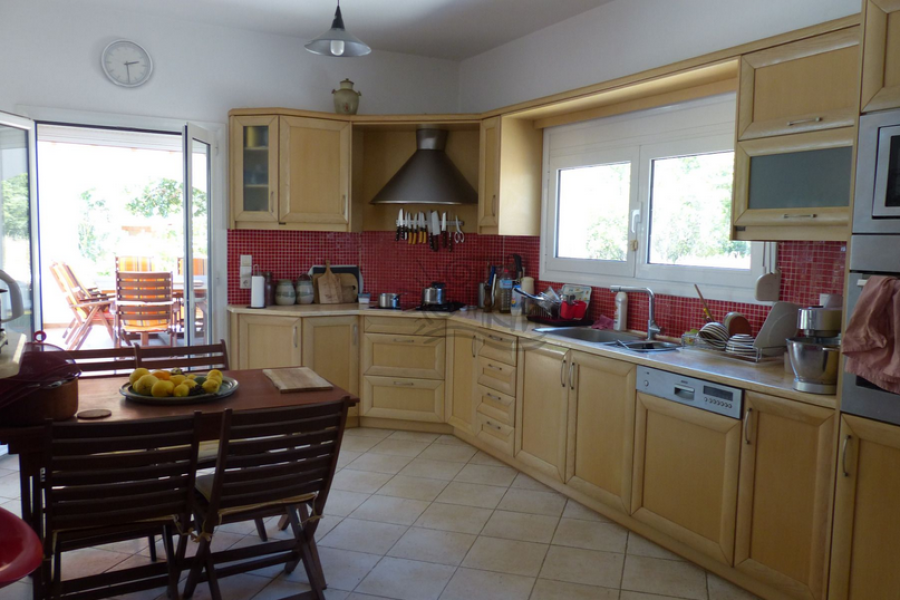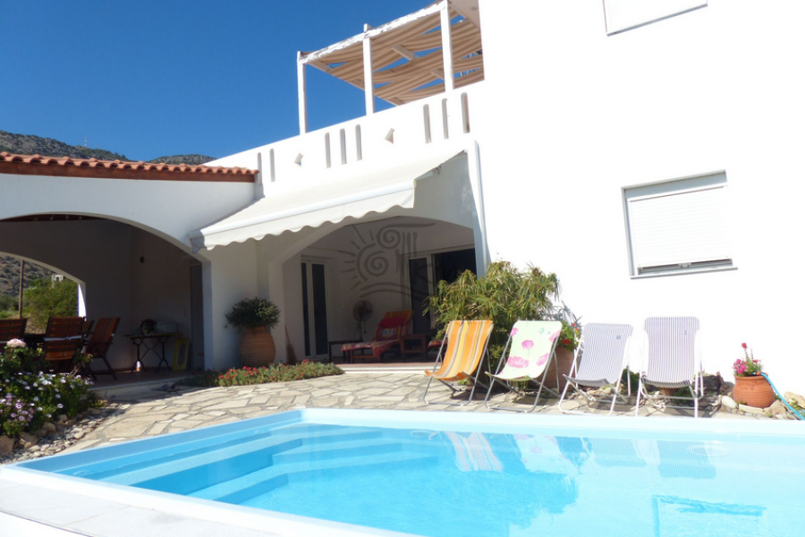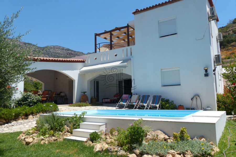 Kreta - Gemeinde Viannos- Arvi. Zu verkaufen Villa von 170 qm mit privatem Pool 17, 5 qm auf einem Grundstück von 700 qm nur 500 Meter vom Meer entfernt. Das Haus ist in zwei Ebenen aufgeteilt, das Erdgeschoss umfasst eine offene Küche und ein Wohnzimmer mit Kamin, ein Esszimmer, ein Schlafzimmer mit eigenem Bad, zwei überdachte Terrassen mit Blick auf den Berg. Auf der zweiten Ebene, drei Schlafzimmer, Badezimmer, Veranden mit herrlichem Bergblick. Das Haus hat auch Außenparkplätze, einen Garten mit vielen Bäumen und Blumen und einen überdachten Kiosk, dekorative Steinelemente.