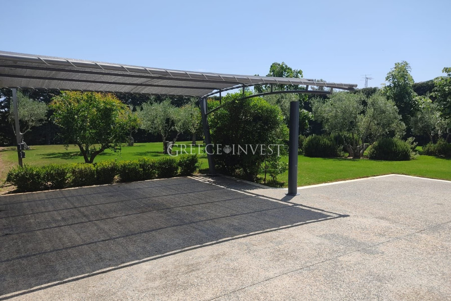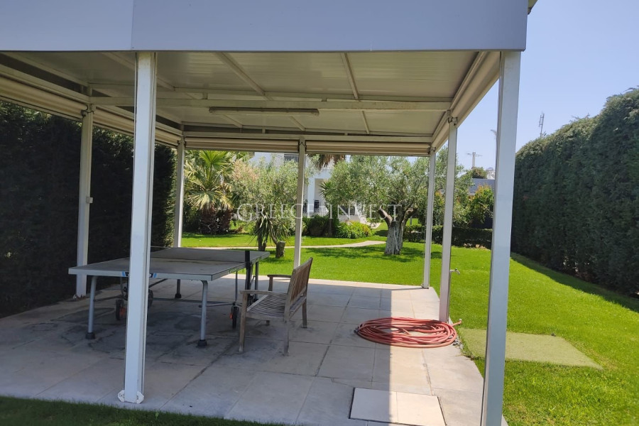 Im Garten befindet sich ein überdachter Parkplatz für drei Autos, ein geschlossener Kiosk mit Schiebetüren und Fenstern, eine Sommerdusche und ein Sommerpavillon. Es besteht auch die Möglichkeit, einen Pool zu bauen. Der Garten verfügt über gepflegte Rasenflächen, Wege und verschiedene Bäume.