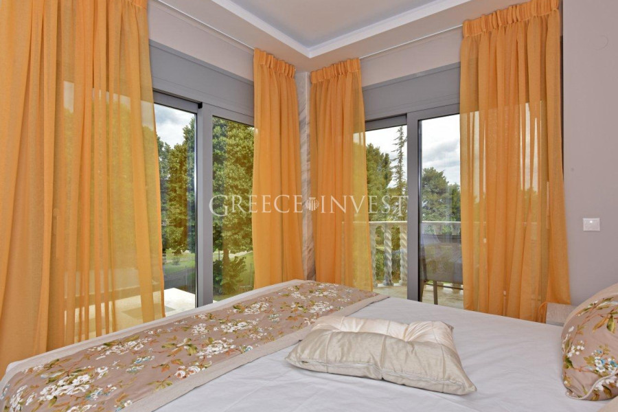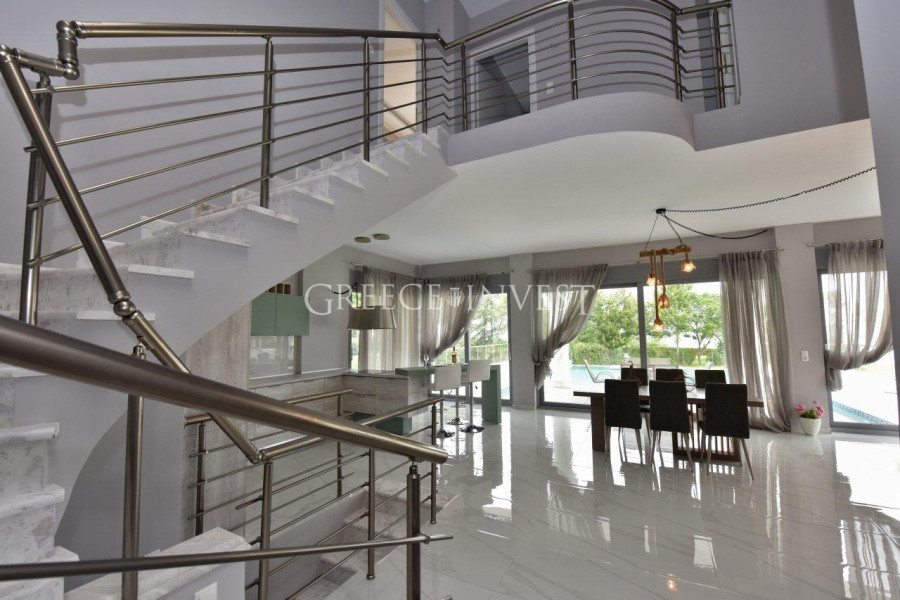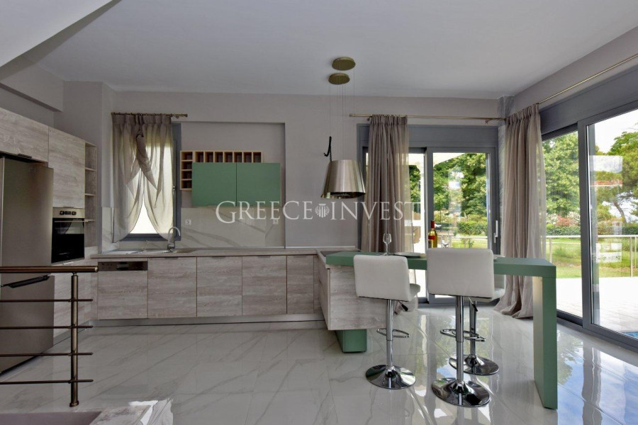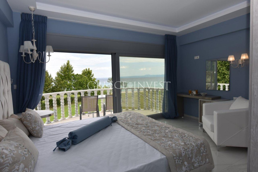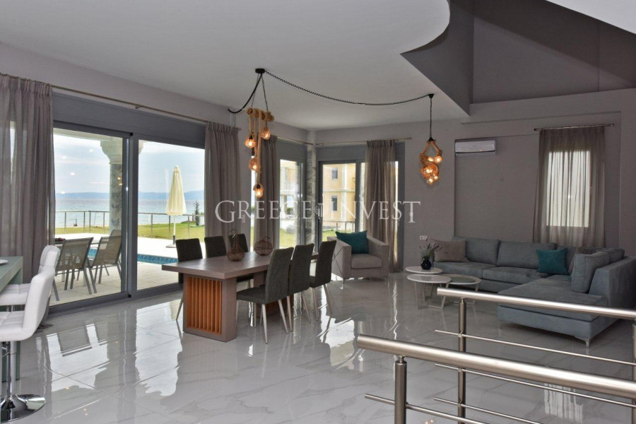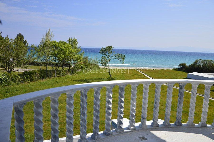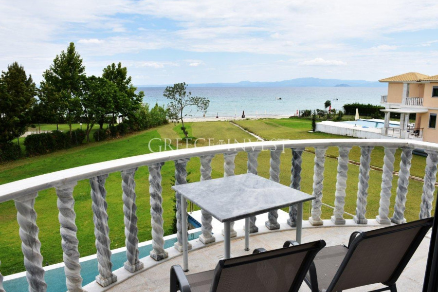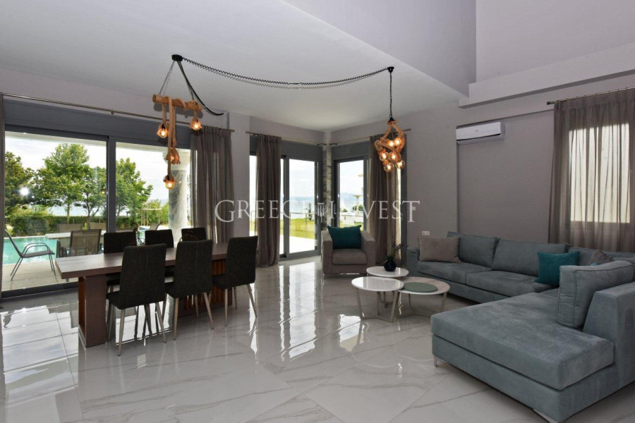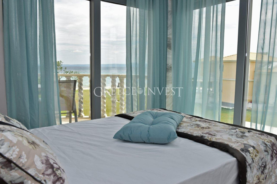 Wunderschöne, schneeweiße Villa im klassischen Stil, direkt an erster Linie auf der Halbinsel Kassandra, Chalkidiki gelegen. Von überall aus bietet sich ein Panoramablick auf das Meer.