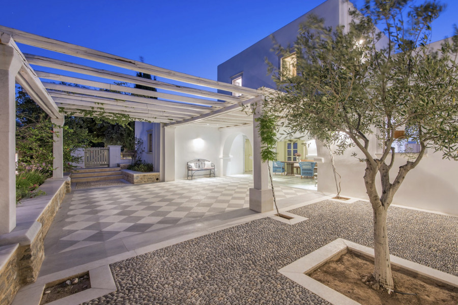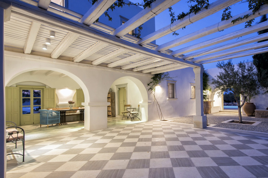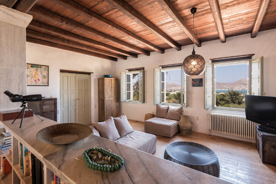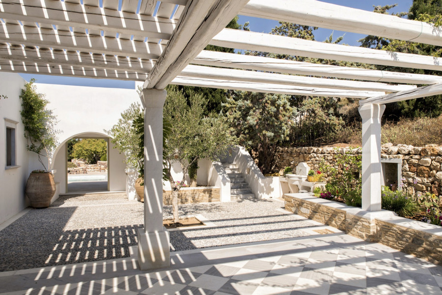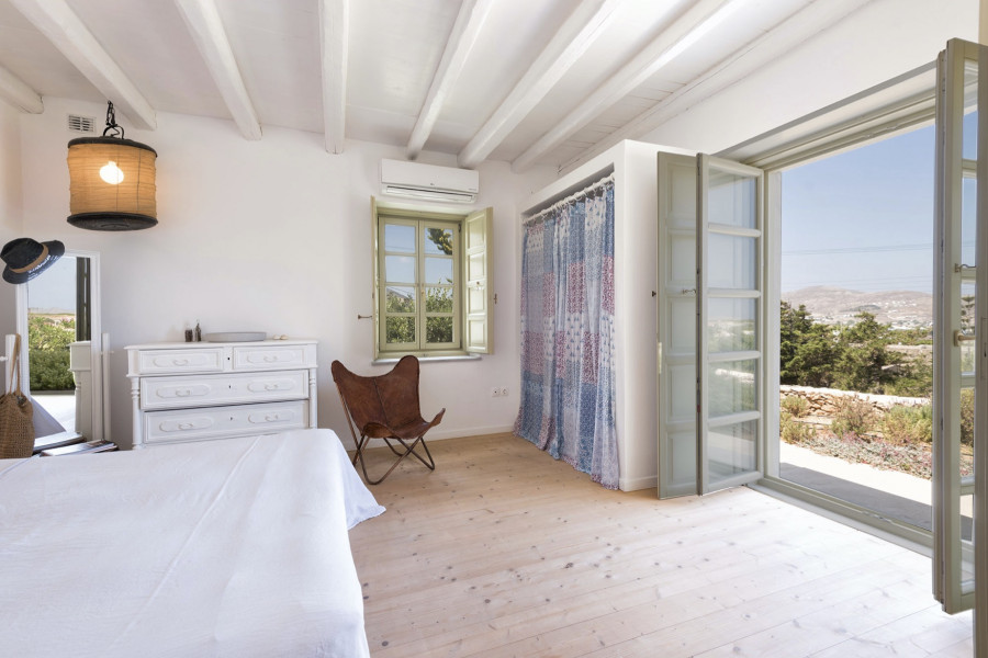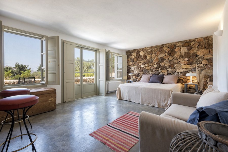 Die 320 m² große Villa auf einem 4547 m² großen Grundstück wurde von einem etablierten lokalen Architekten entworfen und ist Ausdruck der Liebe zur kykladischen Identität, die durch weiß getünchte Wände, hellgrüne Fensterläden und die Verwendung traditioneller Materialien wie Stein, Marmor und Holz definiert wird.