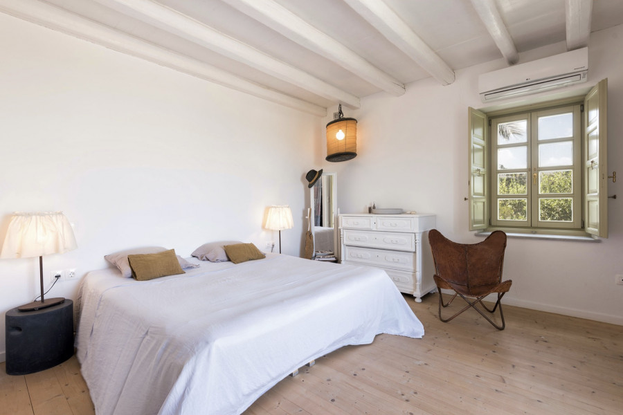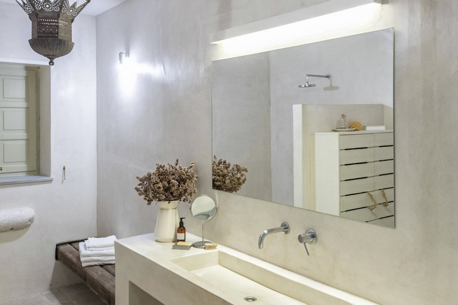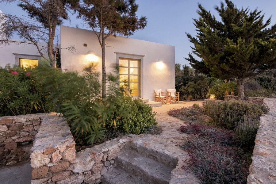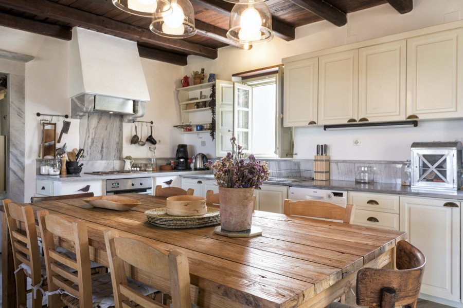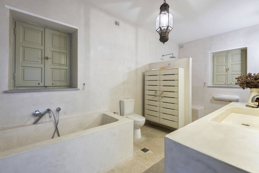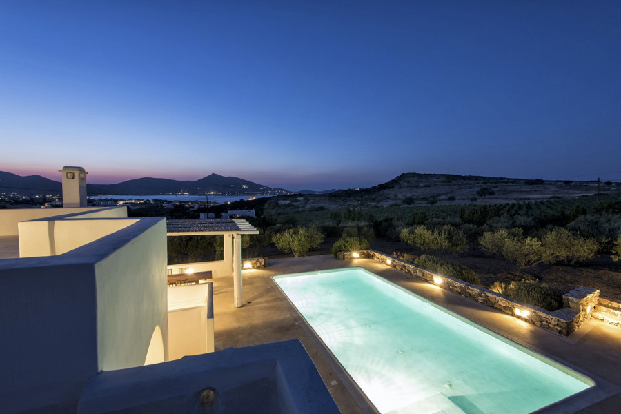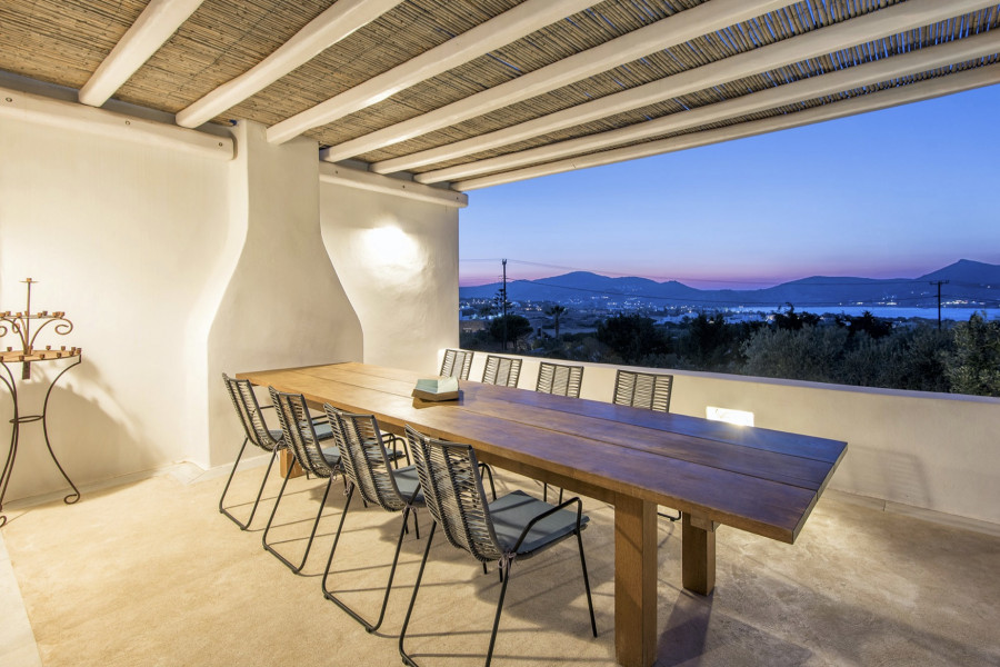Die 320 m² große Villa auf einem 4547 m² großen Grundstück wurde von einem etablierten lokalen Architekten entworfen und ist Ausdruck der Liebe zur kykladischen Identität, die durch weiß getünchte Wände, hellgrüne Fensterläden und die Verwendung traditioneller Materialien wie Stein, Marmor und Holz definiert wird.