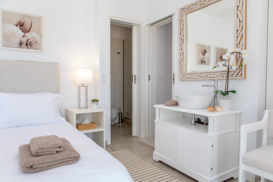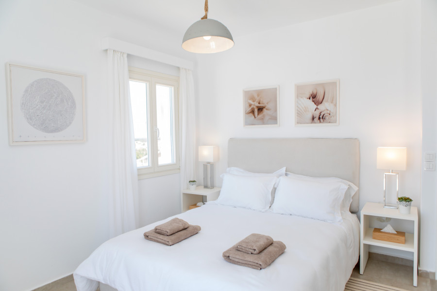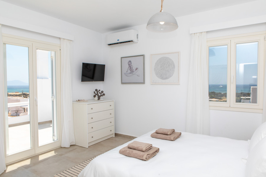Der erste Stock besteht aus einem Hauptschlafzimmer und ein Badezimmer mit Dusche sowie eine Veranda mit Panoramablick auf die Ägäis.