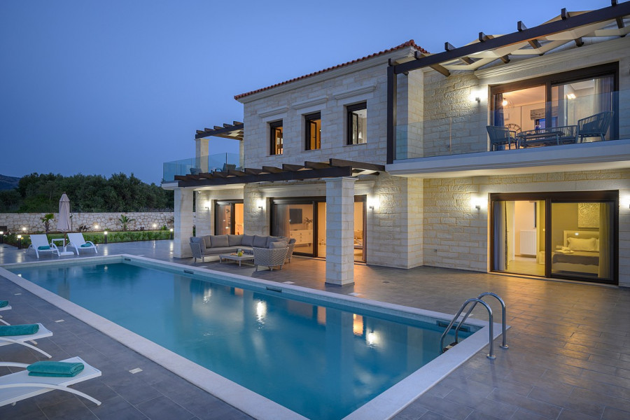 Zustandseinheiten * Hochwertige Einbauküche mit allen Elektrogeräten * Zusätzlicher Wassertank für Wasserschnitte * Automatisches Bewässerungssystem * Privater Pool von 56 m² * Deutsche Aluminiumfenster und Außentürrahmen mit doppelter, wärmeisolierender Verglasung, eingebauten Insektennetzen und elektrisch- Betriebene Rollläden * Hochwertige Ausstattung * SAT TV & Wifi * Videoüberwachung aus der Ferne * Voll ausgestattetes Fitnessstudio * Alarmsystem & Kameras * Geschlossene Garage für 2 Autos & Außenparkplatz * Landschaftsgarten * Grill, Außenküche & Essbereich Bereich * EOT-Lizenz * Zu Fuß zu Annehmlichkeiten * 17 km zum Chania Cetner und 12 km zum Flughafen