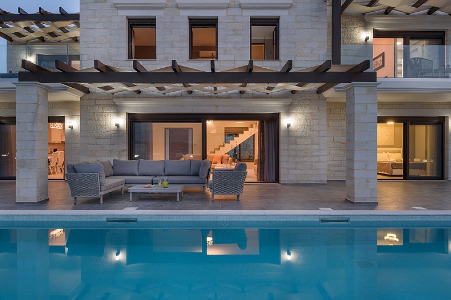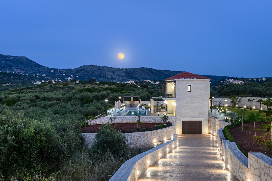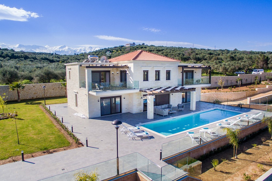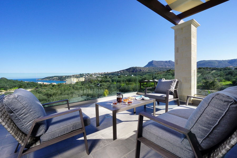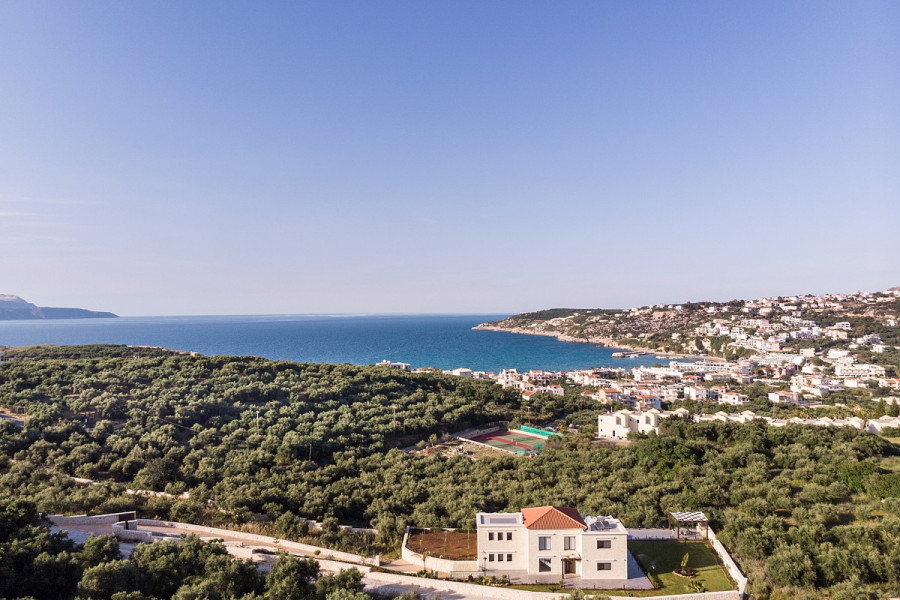 Die Hauptmerkmale der Villa sind hochwertige Konstruktion, luxuriöse Oberflächen, moderner Stil, maximaler Komfort in einer begehrten Gegend. Es befindet sich in erhöhter Lage und bietet einen Panoramablick auf das Meer in einer ruhigen Region und gleichzeitig ganz in der Nähe des geschäftigen Lebens des nahe gelegenen Ferienortes Almyrida. Diese erstaunliche Immobilie kann entweder als Ferienhaus, als ständiger Wohnsitz oder als Mietvilla genutzt werden, da sie über eine EOT-Lizenz verfügt.