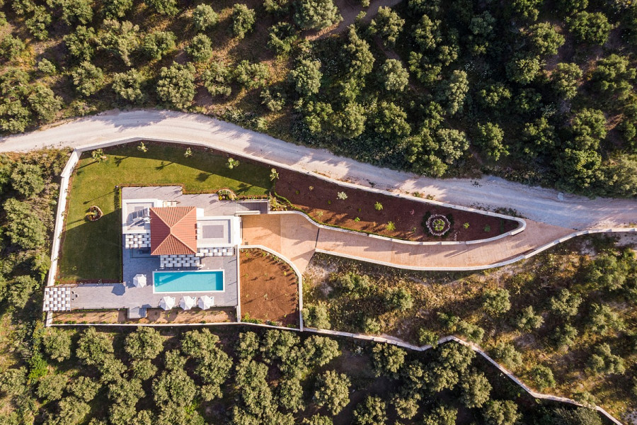 Im Erdgeschoss befinden sich ein geräumiger offener Wohnbereich, eine Küche, ein Esszimmer, ein Schlafzimmer, ein Badezimmer und ein Abstellraum sowie eine Treppe im ersten Stock. Alle Zimmer dieser Ebene verfügen über große Fenstertüren, die zu einer mit Pergola bedeckten Veranda, dem Sonnendeck und dem Pool führen, von dem aus Sie einen Blick auf das Meer und die umliegende Natur genießen können.