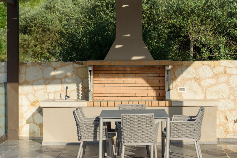 der Villa kann dort gefunden werden. Die Villa verfügt über eine Außenküche, einen Grill- und Essbereich, der mit einer hölzernen Pergola mit Segeltuch bedeckt ist, die an heißen, sonnigen Tagen Schatten und Luft spendet.