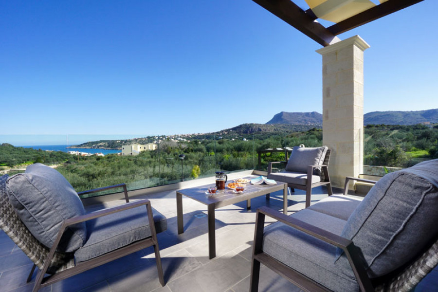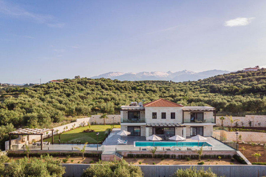 Villa Helios ist eine neue Luxusvilla in einer Feriengemeinde Almyrida an der Westküste der Insel Kreta. Die Villa befindet sich inmitten von Olivenhainen und bietet mit ihren Fenstern einen Blick auf eine atemberaubende Bucht auf einer Seite und die Weißen Berge ( Gebirgszug Lefka Ori), auf der anderen Seite.