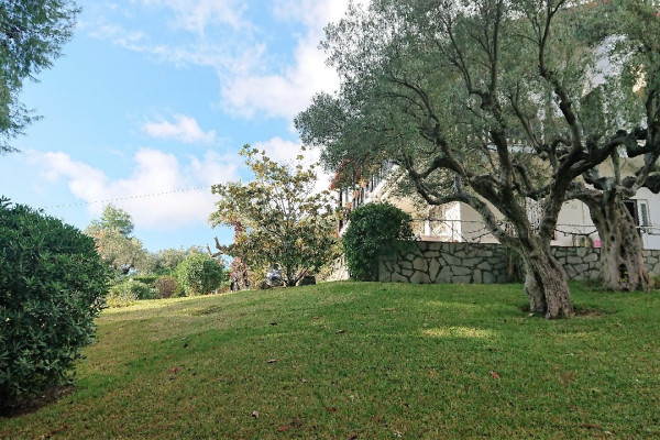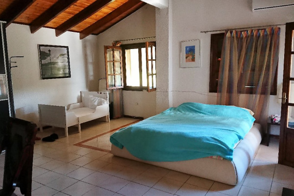 Im Erdgeschoss befindet sich ein voll ausgestattetes Wohnzimmer mit Essbereich und eine Lounge mit Kamin. Die Fassade im Erdgeschoss mit 2 Balkonen und Fenstern bietet einen Blick auf die große Terrasse und den Garten mit Blick auf die Ägäis. Service Personal.