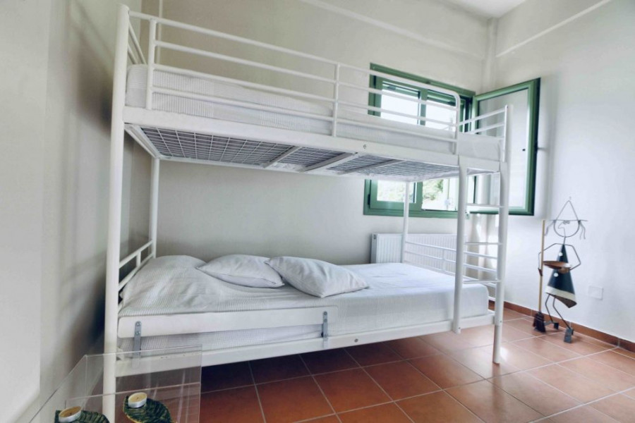 - Zweiter Stock: 60, 50 m² + 19, 60 m² Westveranda + 16, 62 m² Ostveranda. Die zweite Etage verfügt über einen komfortablen, offenen Wohn- / Essbereich mit voll ausgestatteter Küchenzeile, 2 Schlafzimmer (eines mit Doppelbett und eines mit Einzelbett) und 1 WC. Platz für bis zu 5 Personen.