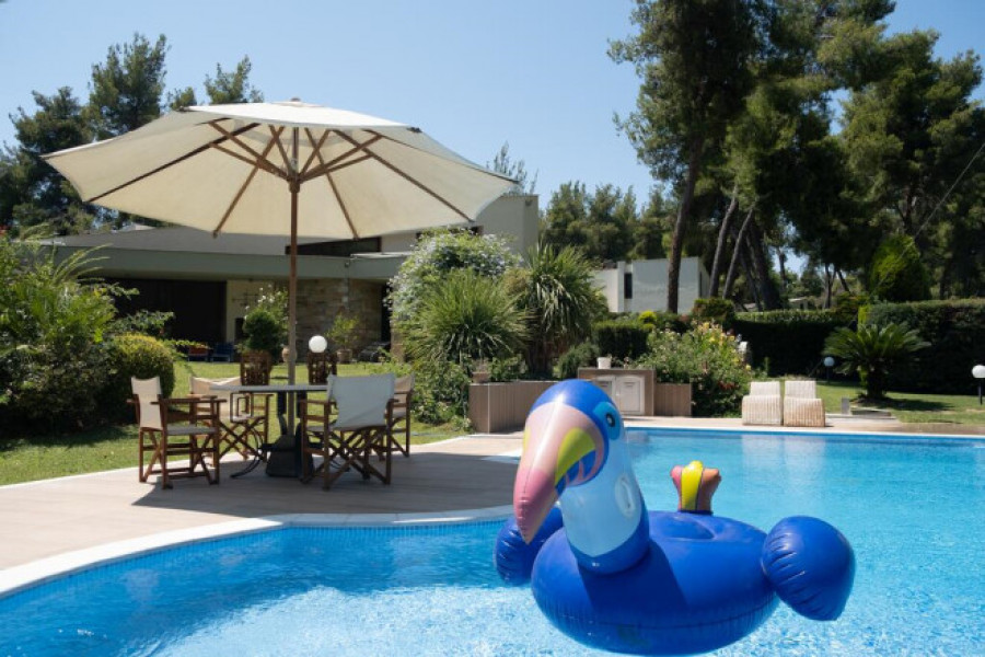 Villa ist Innenraumgestaltung beinhaltet auch Moebel, Klimaanlage, Pool, Parkplat, Rasen, Grill.