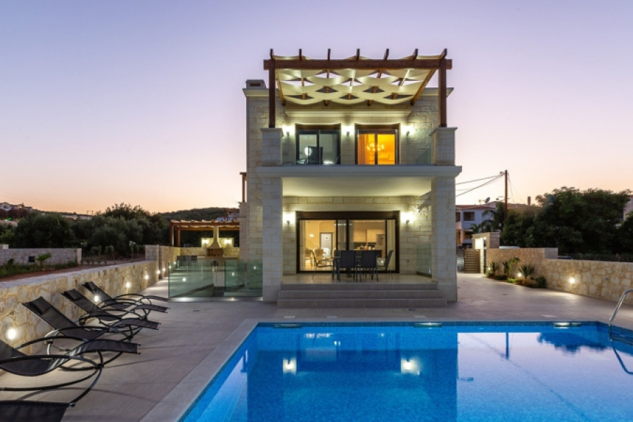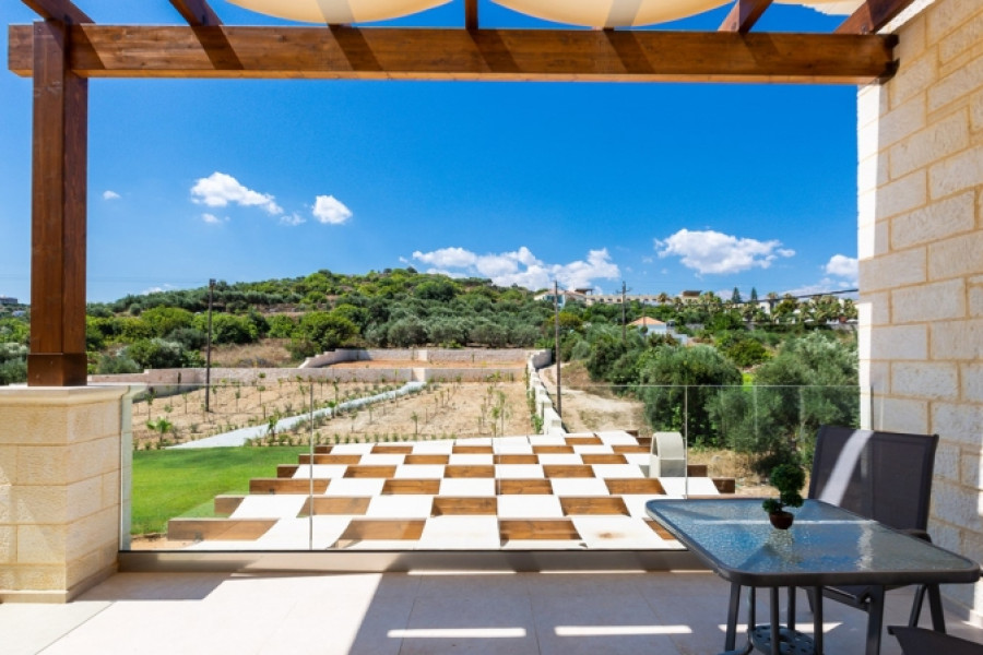 The perfect view from the second floor – it is always green olives and cypresses with a strip of blue horizon of the blue sea. Next to the villa there is a large recreation area: a sun terrace, a swimming pool with a total size of 90 sq.m., a covered pergola for relaxation and barbecue. The ennobled plot of the villa is surrounded by a stone fence in order to ensure complete privacy. For more comfort of the owners the project provides separate from main house a guest house for the staff, with one bedroom, bathroom and small kitchen. Quiet and green area, fresh air, delightful atmosphere, crystal clear sea, proximity to the village and all amenities make this place ideal for living and recreation at any time of the year. The house is made of traditional Cretan stone with elements of concrete and iron awnings and is made in a modern style, creating a delightful atmosphere, an extraordinary aura of comfort and coziness.