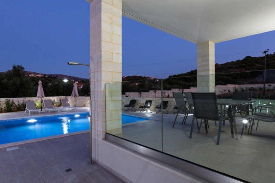 , Fernblick Blick, Fenster und Türen: Aluminium, Tür: Sicherheitstür, Parkplatz, Lager, Garten, Kamin, Pool, Blick, Klimaanlage, möbliert - eingerichtet, hell, Beschattungssystem , Solar Boiler , gestrichen - Kaufpreis: 980.000 € Villa ideal for family, same time, close to the village and the sandy beach of Almyrida. Discover the absolute carelessness and relaxation you desire in this spacious stone villa with a large pool and stunning views of the olive groves and the Cretan Sea.