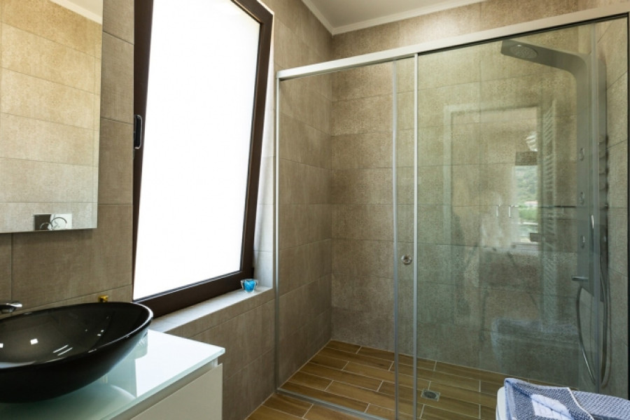 -Italian non-slip tiles lining in Bathroom κ WC; -Alarm system κ cameras; -Video surveillance from a distance; -Exterior lighting for villa, pool κ plot; -Spacious veranda κ big balconies; -Exterior protective glass railings on the balconies and inox-based courtyard; -Electrical entrance gate; -Stamped flooring at the entrance of the house; -Parking with wooden pergola; -Geast house 29, 7 sq.m.; -Interior doors from mdf κ solid wood frames; -Water-sewage tank (drainage); -Stone fence around the plot; -Olives tree for the olive oil.