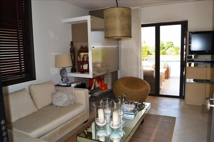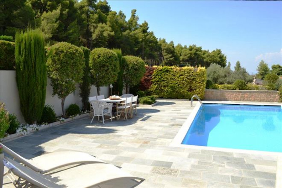 Einfamilienhaus ist doppelfassade Layout Bietet an schoen auf den Berg, in den Wald, beinhaltet auch Moebel, Kamin, Klimaanlage, Markisen, Pool, Parkplat, Garten, Rasen, Grill, Heizung, Alarm, Abstellraum.
