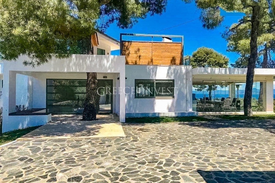 Vier weiße moderne Villen umgeben von Kiefernwäldern mit Panoramablick auf das Meer. Die Villen befinden sich in einer abgelegenen Lage, nur einen Kilometer von einer renommierten Stadt mit ganzjähriger Infrastruktur entfernt.