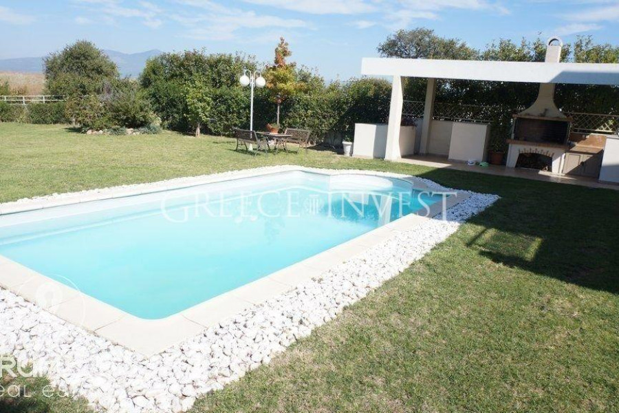 In der Gegend von Kardia befindet sich ein modernes Ferienhaus auf einem Grundstück von 1500 Quadratmetern, umgeben von einem grünen und blühenden Garten mit Rasen und Bäumen, automatischer Bewässerung, einem Pool mit Grillplatz. Das Ferienhaus bietet einen schönen Blick auf das Meer und ist über eine asphaltierte Straße erreichbar. Für den Bau wurden hochwertige Materialien verwendet.