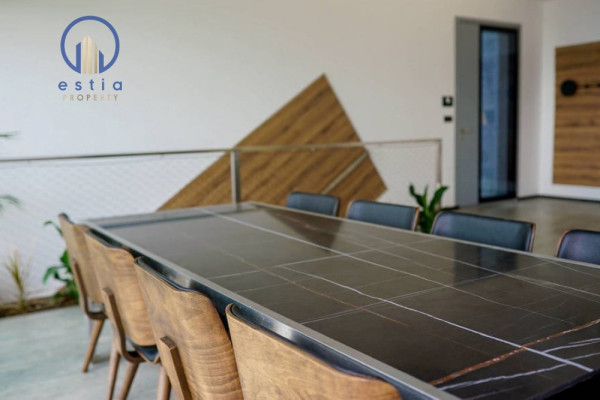 Auf dem Eingangsgeschoss der Villa finden Sie einen großen Küchenraumraum mit einer Insel und drei Terrassen.