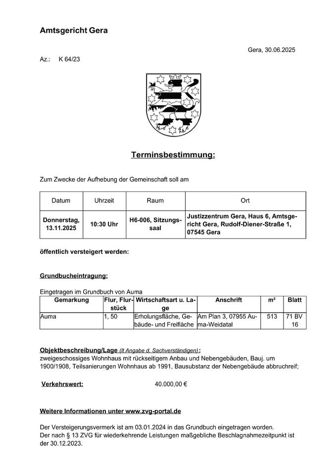 Versteigerung am 13.11.: Modernisiertes Einfamilienhaus in Auma