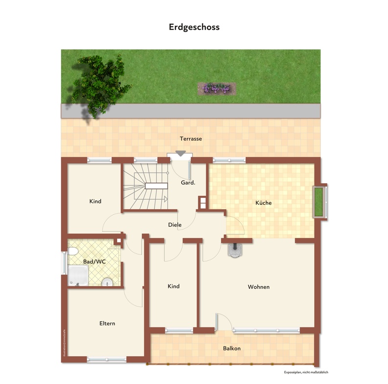 Eine Gewähr für die Richtigkeit sämtlicher im Exposé enthaltener Angaben und Abmessungen wird trotz sorgfältiger Bearbeitung von Daten, Bildern und Informationen nicht übernommen.