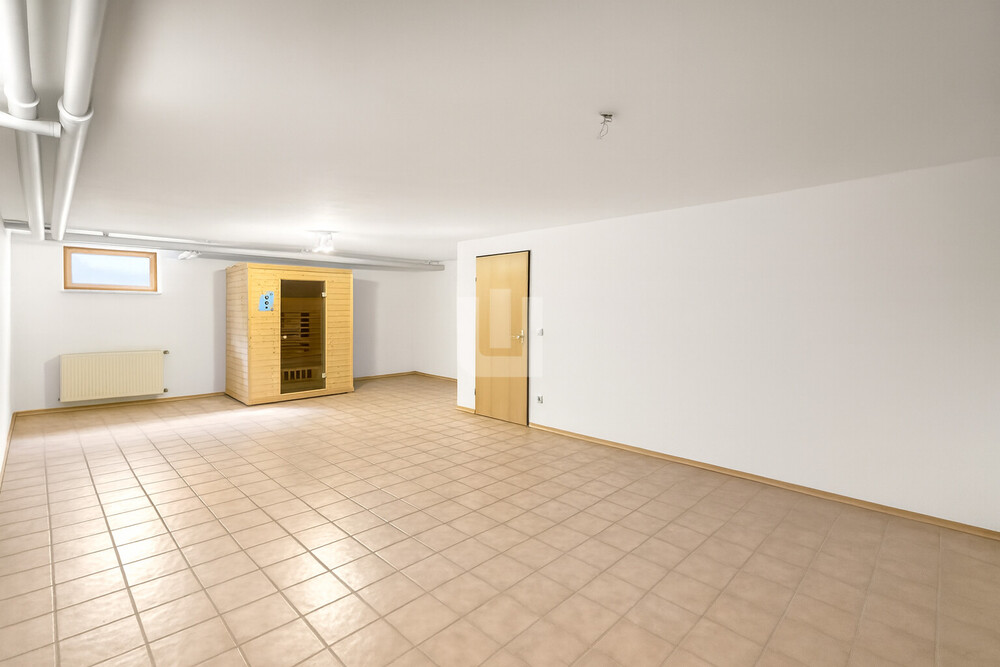 Im Untergeschoss finden Sie einen vielseitigen Hobbyraum mit wohnlichem Charakter und integrierter Sauna vor – ideal für entspannte Abende oder eine private Wellnessoase. Ein großer Abstellraum, auch als weitere Speisekammer nutzbar, bietet ausreichend Stauraum für Vorräte und Haushaltsutensilien. Ein Waschraum und zusätzliche Stauflächen im Flur sorgen für optimalen Komfort und Ordnung.