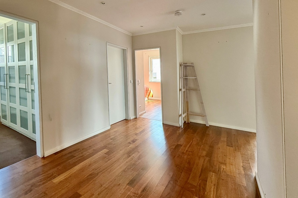 Die Wohnung liegt im ersten Obergeschoss eines gepflegten Mehrfamilienhauses aus dem Jahr 1983 und bietet rund 120 m² stilvolle Wohnfläche. Bereits der großzügige Eingangsbereich empfängt Sie mit einem einladenden Ambiente. Zwei gut geschnittene Schlafzimmer, ein praktischer Abstellraum mit maßgefertigten Einbauschränken sowie ein elegantes Tageslichtbad mit bodengleicher Dusche und ein separates Gäste-WC sorgen für höchsten Wohnkomfort.