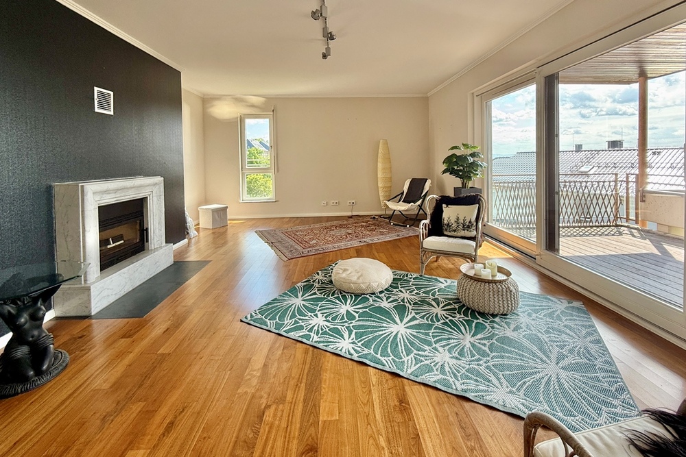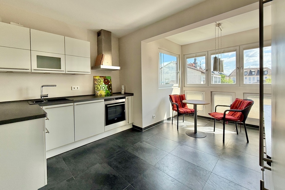 Das Herzstück der Wohnung ist der helle, repräsentative Wohnbereich mit breiter Fensterfront und Zugang zum sonnigen Balkon – genießen Sie hier einen einzigartigen Panoramablick über die gesamte Region. Für gemütliche Abende sorgt der offene Kamin mit Kassetteneinsatz. Die moderne, voll ausgestattete Küche mit integriertem Essplatz fügt sich harmonisch in das stimmige Gesamtbild ein.