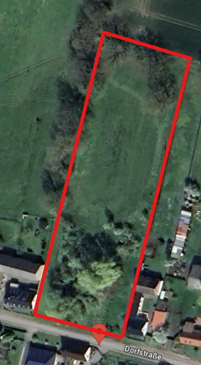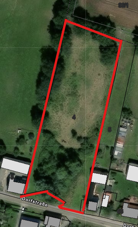 Grundbuchangabe: Das Grundstück ist im Bestandsverzeichnis als „Gebäude- und Gebäudenebenflächen, Grünland, Im Dorfe“ geführt. Damit beschreibt das Grundbuch die Mischung aus bebauten und unbebauten Flächen sowie die Lage innerhalb des historischen Dorfbereichs. Für die Bebaubarkeit gilt jedoch die aktuelle planungsrechtliche Grundlage nach § 34 BauGB.