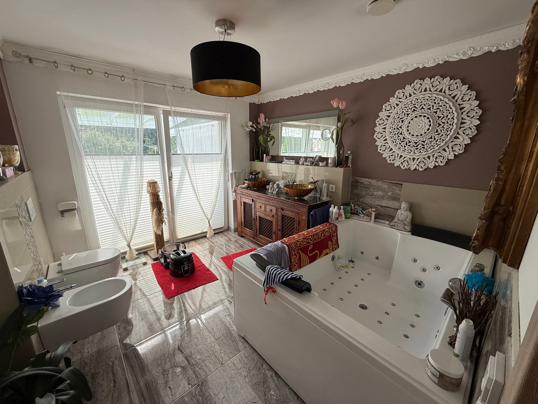 An den Eingangsbereich schließt sich auf der einen Seite der helle Wohn-/Essbereich mit Kaminofen, offener Küche sowie ein Ausgang zur Sonnenterrasse und in den herrlich angelegten Garten an. Dem Wohnbereich schließt sich der Ruhebereich mit 2 Kinderzimmern und einem Tageslicht-Duschbad an. Auf der anderen Seite vervollständigen das Elternschlafzimmer mit Ankleidebereich, Hauswirtschaftsraum und ein großzügiges Tageslicht-Dusch-/und Wannenbad das Angebot im Erdgeschoss. Im Obergeschoss stehen Ihnen ein großes Studio, mit zwei weiteren Schlafzimmern und ein Tageslicht-Duschbad zur Verfügung.