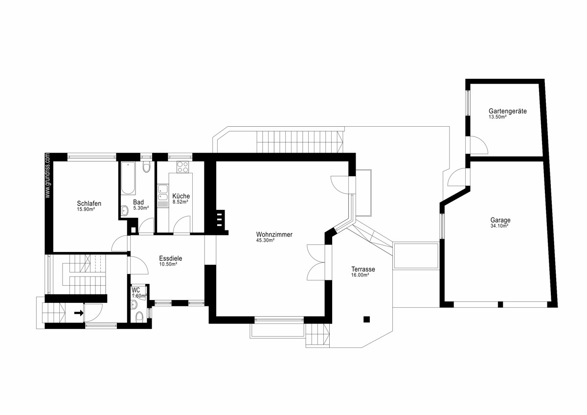 Der Bestand verfügt über drei Räume im Erdgeschoss, davon ein Wohnzimmer, ein separates Ess- oder Schlafzimmer, eine abgeschlossene Küche, ein Badezimmer, ein Gäste-WC mit Garderobe.