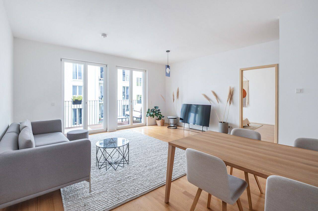 Wohn- und Esszimmer mit Zugang zum Balkon - Moderne Wohnung mit 3 Zimmern und 2 Balkonen im Friedrichshainer Samariterkiez