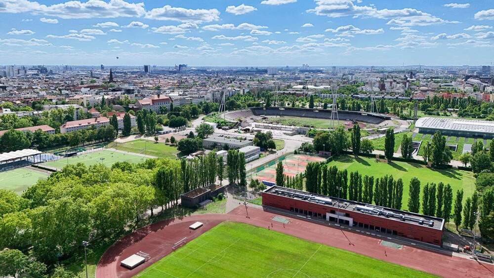 • Direkt gegenüber vom Sportplatz am Mauerpark -