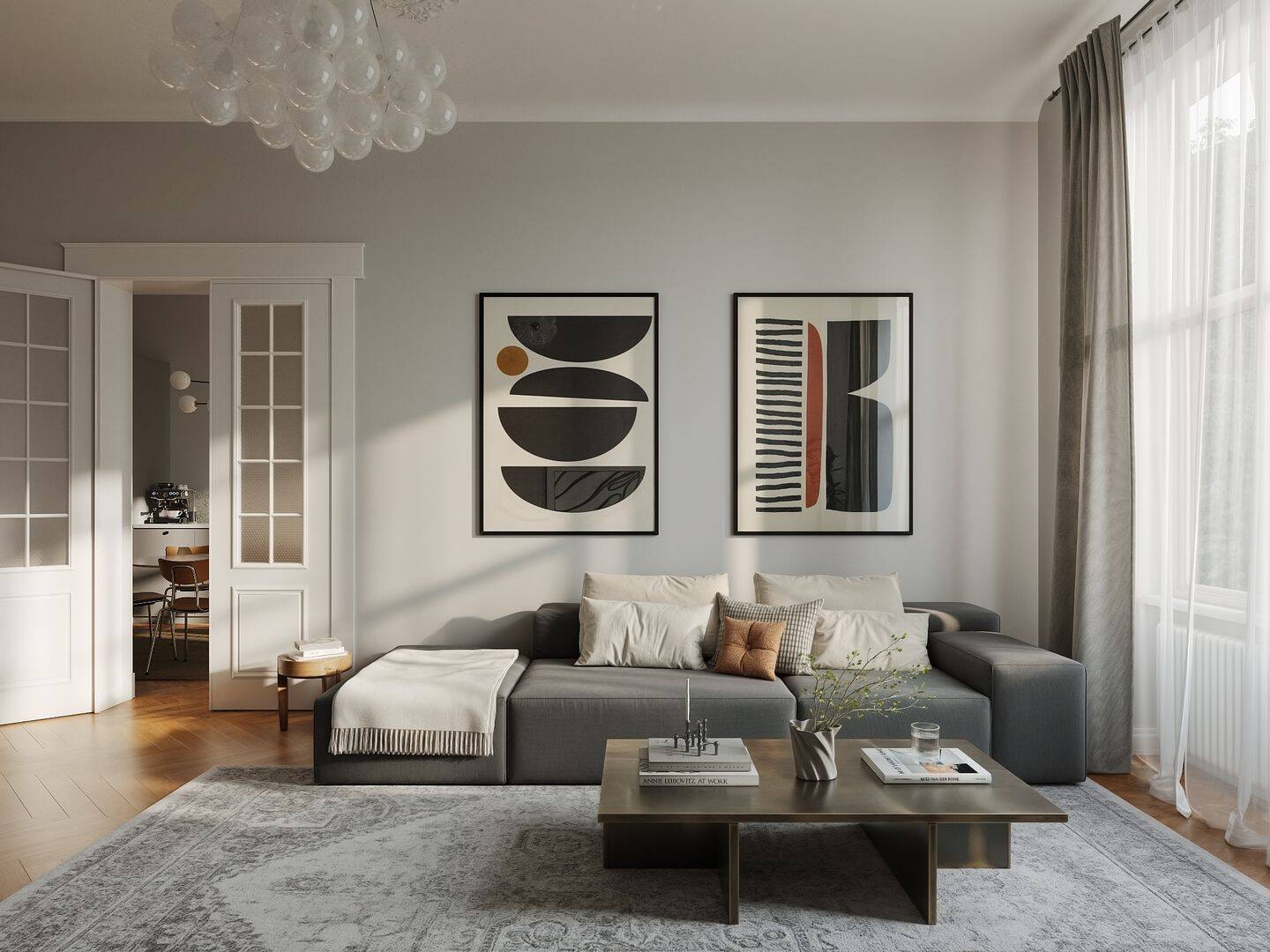 geräumiges, helles Wohnzimmer - Beispielmöblierung - Top-sanierte 4-Zimmer-Altbau-Wohnung nahe Botanischer Garten