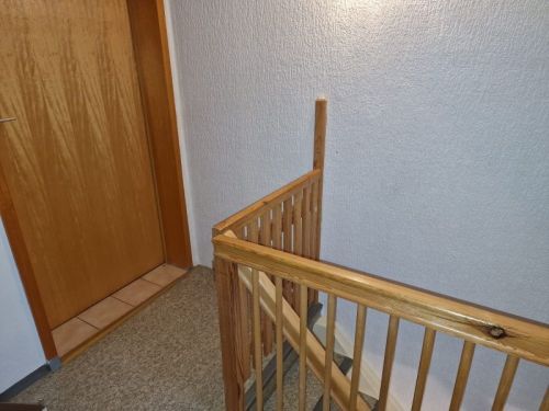 Erdgeschoss: Wohnzimmer (Teppich), kleiner Nebenraum, kleine Küche (Fliesen), Öffnung für ehemaligen Kachelofen zum Flur, Eingangsbereich (Fliesen), WC (Fliesen) Obergeschoss: Schlafzimmer (Teppich), Ankleide (Teppich), Bad mit Wanne und WC (PVC), Flur Dachgeschoss: kleines Kinderzimmer (Teppich) Gewölbekeller Garage in kleinem gegenüber liegenden Häuschen Carport gegenüber liegend, von Gemeinde für 20 EUR angemietet. Garten, Richtung Schützenhaus