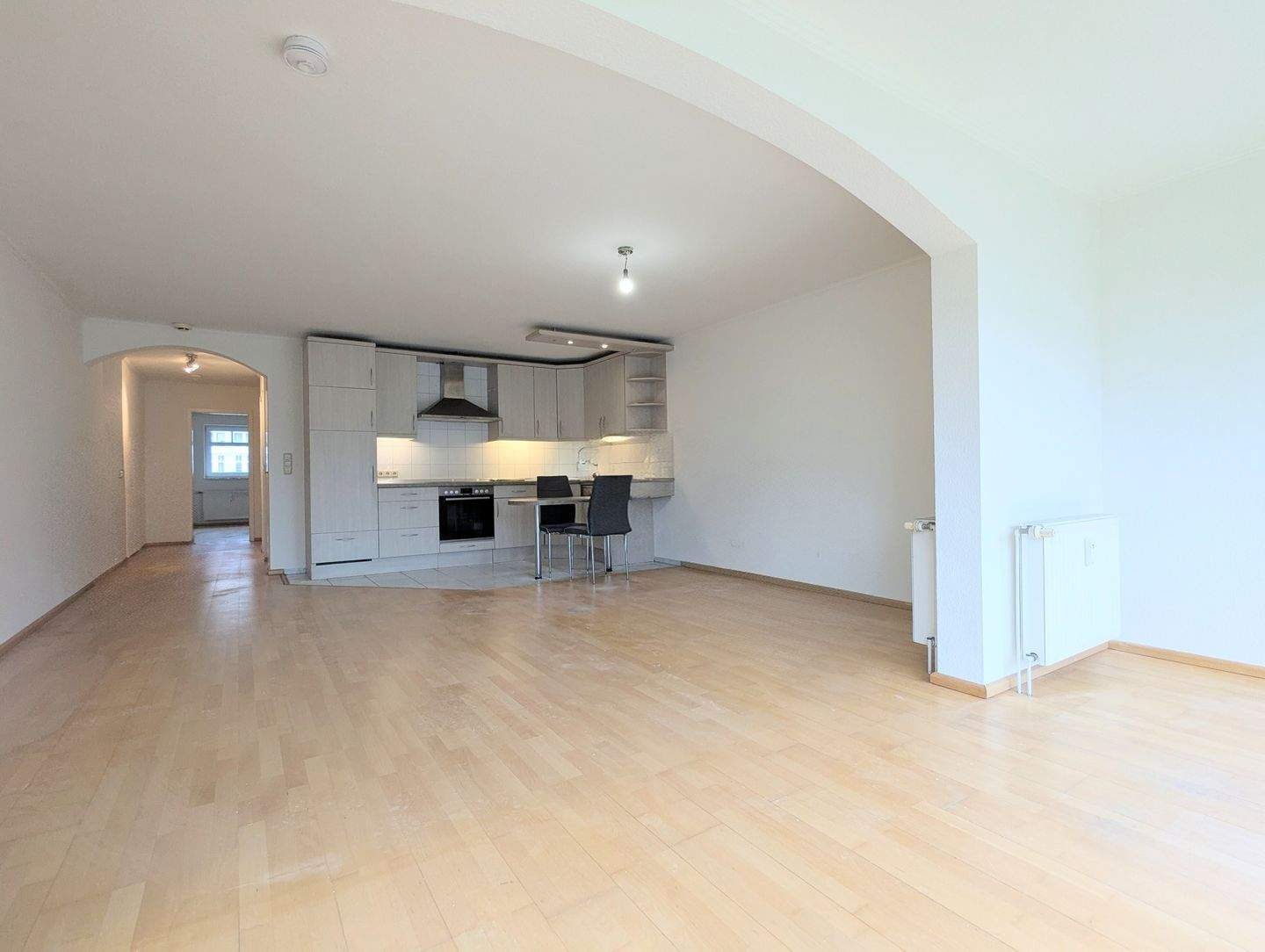 • Großes Wohnzimmer mit offener Einbauküche. -