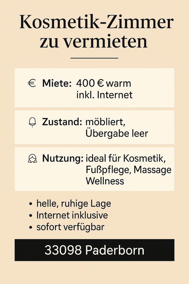 Sie befinden sich hier: Kosmetik-Zimmer zu vermieten – ab 500 € warm inkl. WLAN in Paderborn - 3204261701-277-2162 | 1A-Immobilienmarkt.de