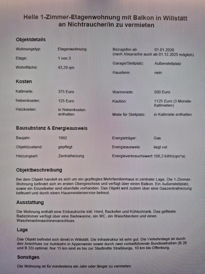 Sie befinden sich hier: ZU VERMIETEN: 1-Zimmerwohnung in Willstätt in Schutterwald - 3204446400-277-9032 | 1A-Immobilienmarkt.de