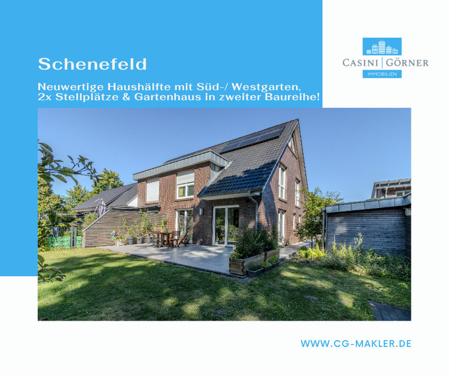 Sie befinden sich hier: Neuwertige Haushälfte mit Süd- Westgarten, 2x Stellplätze und Gartenhaus in zweiter Baureihe! in Schenefeld - 25EGGPF6SME7 | 1A-Immobilienmarkt.de