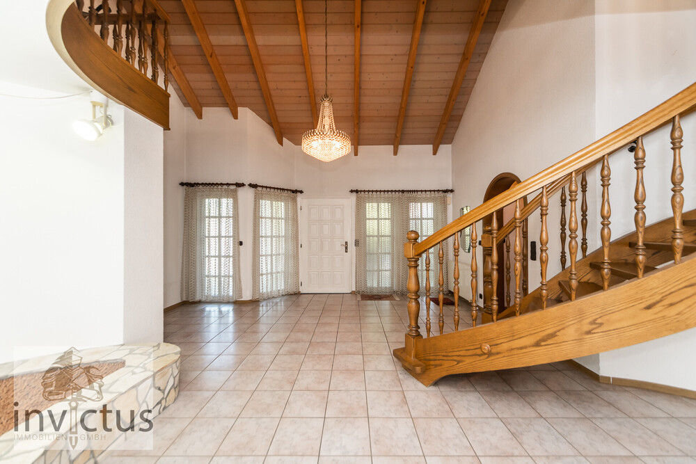 Bereits der repräsentative Eingangsbereich vermittelt beim Betreten ein Gefühl von Weite, Ankommen und Eleganz. Von hier aus entfaltet sich das Haus mit all seinen Vorzügen. Der offene Wohn- und Essbereich bildet das Herzstück der Villa. Hier treffen stilvolle Architektur und wohnliche Behaglichkeit aufeinander und schaffen ein Ambiente zum Wohlfühlen. Die beiden Kamine setzen Blickfänge, die dem Raum Wärme und Charakter verleihen. Große Fensterfronten geben den Blick in den Garten frei und verbinden den Wohnraum mit der weitläufigen Terrasse – Offenheit und Geborgenheit verschmelzen hier auf eindrucksvolle Weise. Ein Gästezimmer mit Gäste-Bad ist im Erdgeschoss selbstverständlich vorhanden, ebenso eine Küche und ein praktischer Hauswirtschaftsraum.