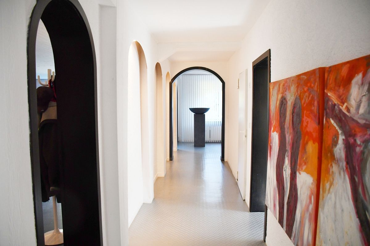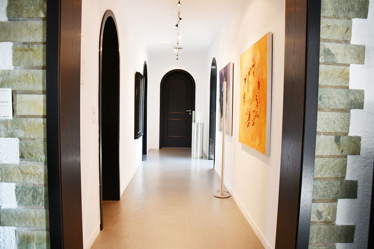 Das taghelle Untergeschoss mit direktem Zugang in den traumhaften Garten und zur Doppelgarage bietet neben einem Arbeitszimmer, einem Tageslicht-Duschbad, dem Hauswirtschaftsraum und dem Heizungskeller auch eine wohltuende Saunazone – ein Bereich, der ganz der Entspannung gewidmet ist. Darüber hinaus steht ein besonders großzügiger, vielseitig nutzbarer, ca. 60 m² großer, Multifunktionsraum zur Verfügung; eine große Fenster-Hebe-Schiebe-Tür öffnet diesen Raum zum Garten hin und lässt viel Licht sowie den Blick ins Grüne herein. Direkt davor plätschert ein mediterran anmutender Springbrunnen und verleiht diesem Bereich eine besonders angenehme, fast südliche Atmosphäre. Mit wenig Aufwand kann hier auch wieder ein exklusives Hallenschwimmbad entstehen – eine Option, die den luxuriösen Charakter des Hauses noch unterstreicht. Ebenso besteht die Möglichkeit, im Untergeschoss eine separate Einliegerwohnung zu realisieren – ideal für Gäste, Familienmitglieder etc.