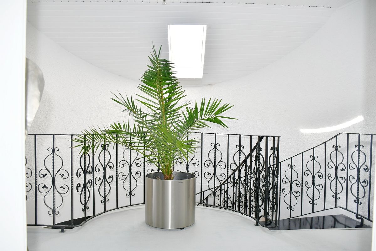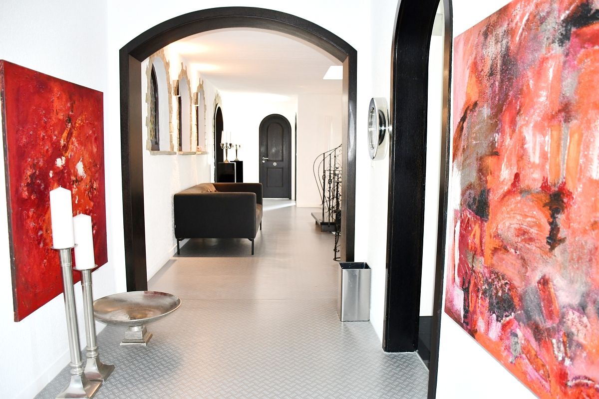 Von hier aus gelangt man auf die mediterran anmutende Sonnenterrasse, deren Rundbögen dem Außenbereich einen besonderen Charme verleihen. Ob Frühstück im Sommerwind, Lesen im Schatten alter Bäume oder gesellige Abende im Freien vor dem Außenkamin – dieser Platz lädt zum Innehalten und Genießen ein.