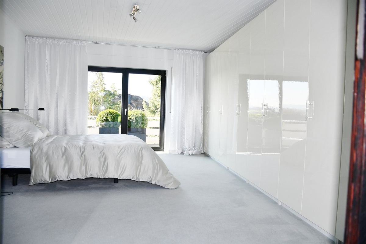 Die Küche ist hochwertig ausgestattet und durchdacht geplant, mit einem angrenzenden Vorratsraum für zusätzlichen Komfort. Insgesamt bietet das Haus ca. 370 m² hochwertig ausgestattete Wohnfläche auf drei Ebenen, verteilt auf 11 großzügige Zimmer, die individuelle Gestaltungsmöglichkeiten eröffnen. Drei moderne Tageslichtbäder, ein Gäste-WC und eine Sauna schaffen ein rundum angenehmes Wohngefühl. Das Schlafzimmer im Erdgeschoss verfügt über direkten Zugang zur Terrasse und zu einem Balkon mit traumhaftem Fernblick über die grüne Umgebung – ein Ort, an dem der Tag besonders schön beginnt. Im Dachgeschoss sorgen vier weitere helle Räumlichkeiten für Freiraum, ob für Familie, Gäste oder kreative Nutzung.