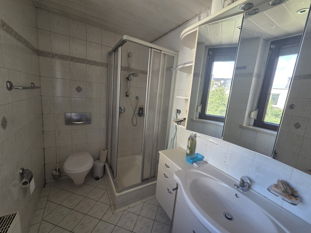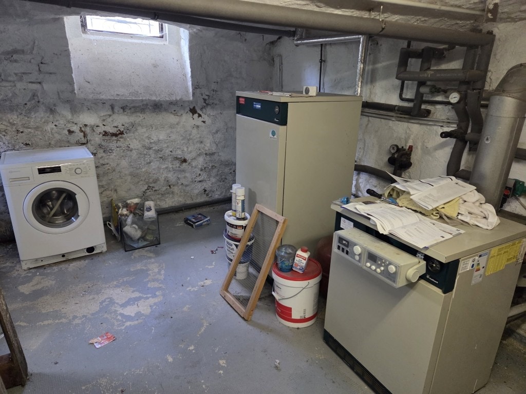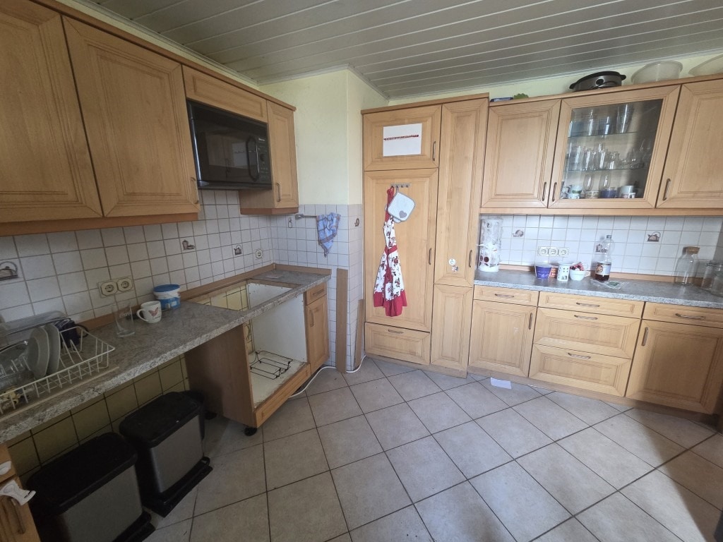 Im Erdgeschoss befindet sich eine gemütliche 2-Zimmer-Wohnung, die über einen Kamin verfügt und damit eine besondere Wohnatmosphäre schafft. Im Ober- und Dachgeschoss erstreckt sich eine großzügige Wohnung mit insgesamt sieben Zimmern, 2 Bädern und einer Küche. Das Haus ist mit einer Gas-Zentralheizung (BJ 1980) ausgestattet und an eine vollbiologische Kläranlage (BJ 2015) angeschlossen. Die Bäder wurden 2008 und 2012 erneuert. Das Dach ist mit Bitumen-Dachschindeln eingedeckt (2009). Die Elektoinstallation wurde 2012 erneuert. Das Haus ist mit Holzfenstern 2-fach-Isolierglas ausgestattet. (BJ 2008 + 2015). Zudem ist die Immobilie voll unterkellert und bietet zusätzlichen Stauraum im Dachboden.