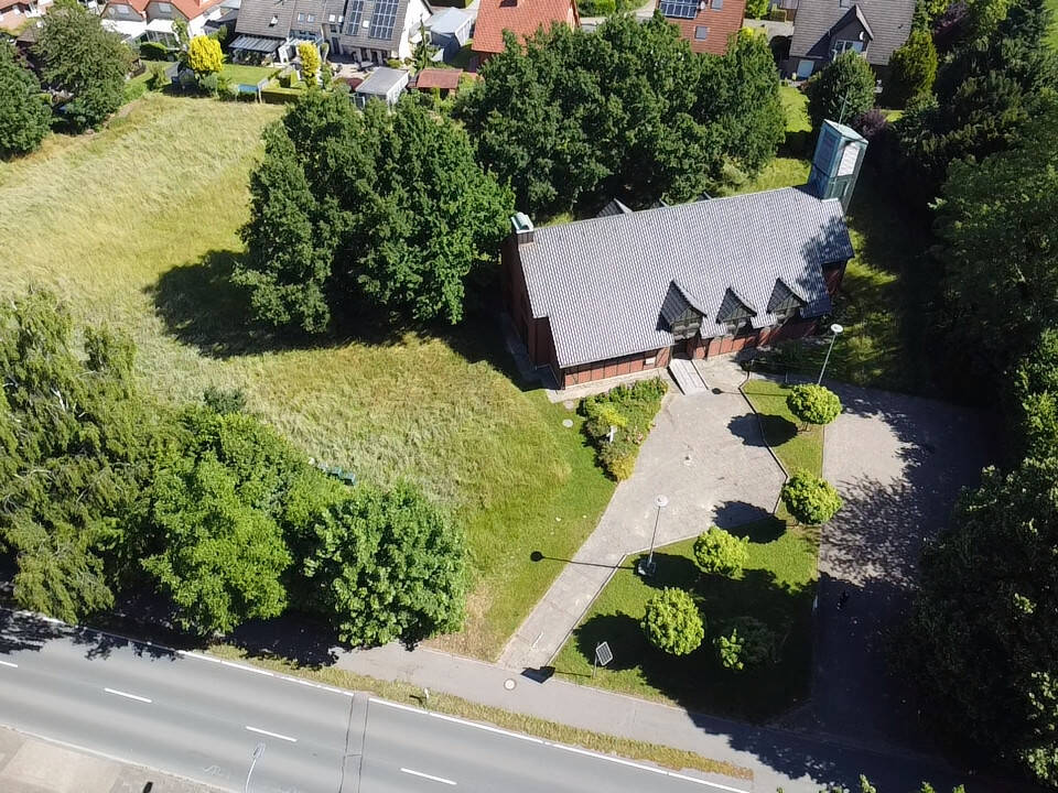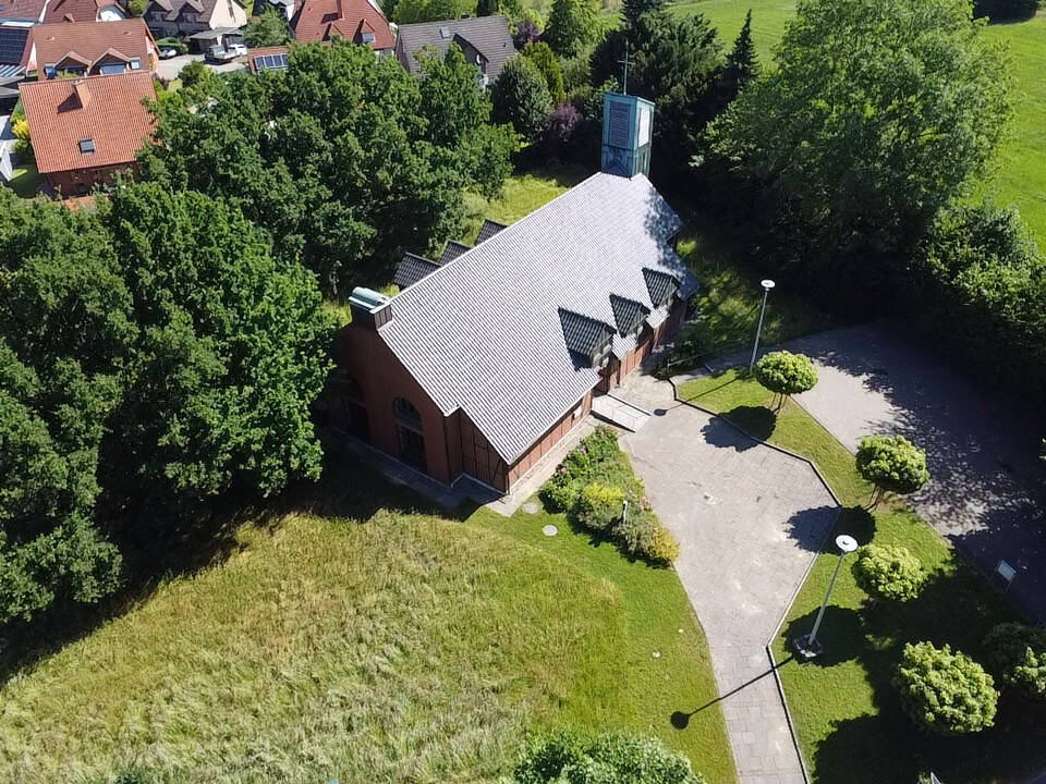 • Drohnenaufnahme - Unikat mit Perspektive - Kirchgebäude auf großem Areal mit Entwickungspotential in Exter!