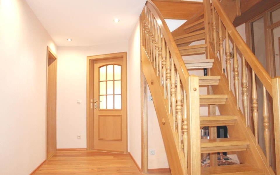 Vom Hof aus gelangt man über vier Stufen und eine anschließende Treppe in die Wohnung. Auf der unteren der beiden Etagen bietet die Wohnung einen großzügigen, sehr freundlichen Flur, ein Wohnzimmer mit stilvollem Kamin, der ideal für kalte Wintertage ist, eine Küche mit angrenzender Vorratskammer sowie eine ca. 35 m² große Terrasse.
