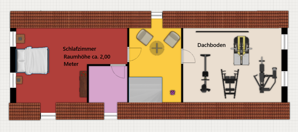 In der oberen Etage befindet sich ein kleiner Flur. Zur linken Seite liegt das Schlafzimmer mit einem separaten, sehr schönen und höchst praktischen Ankleidezimmer. Auf der rechten Seite befindet sich der Dachboden, der vielfältige Nutzungsmöglichkeiten und reichlich Stauraum bietet.